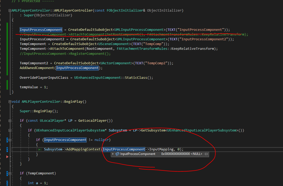 AMLPlayerController를 상속받은 블루프린트클래스를 쓰고 있었는데, 그 내부 데이터 InputProcessComponent가 손상되어서(아마 UProperty 지정자를 바꾸면서 손상된 것 같다) 런타임 중 해당 데이터가 무조건 null로 잡히는 버그였다.